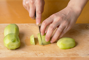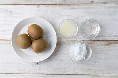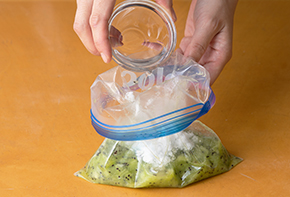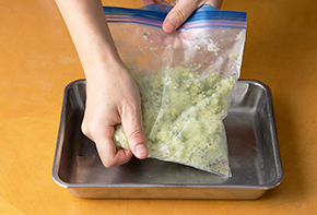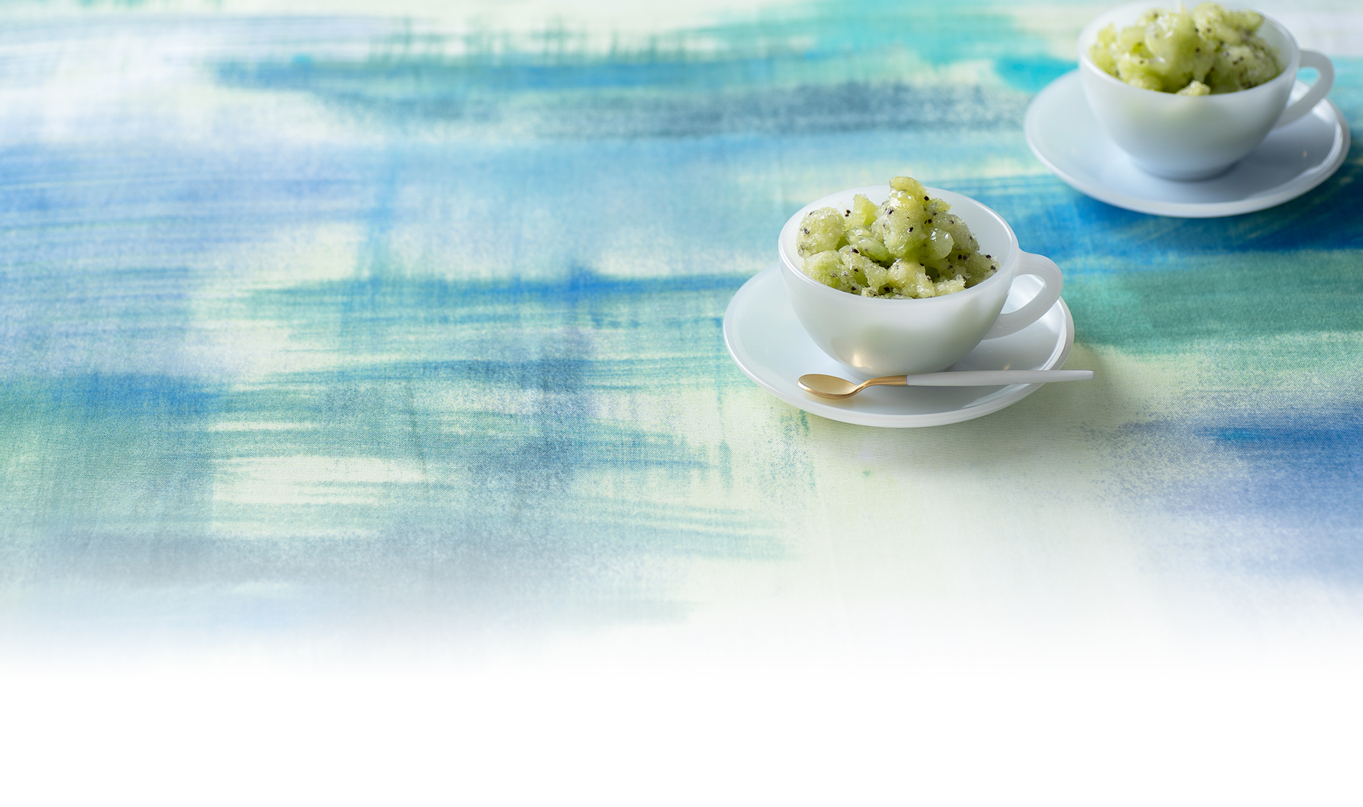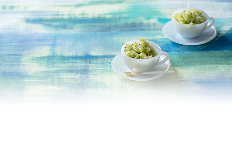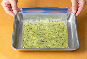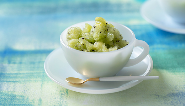 全体がしっかりと固まったら、器に盛ってカルピスをかけていただきます。凍る途中に何度か揉むと細かいシャーベットができます。
