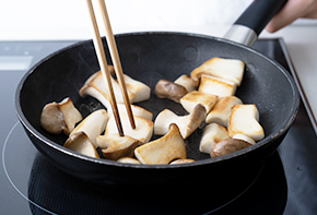 小さめのフライパンに半量のバターを溶かし、エリンギを加え強火で焼き色をつけるように焼きます。