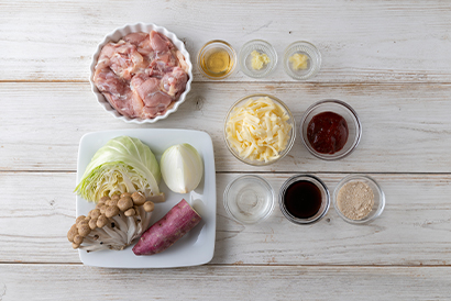 キャベツは一口大に切り、玉ねぎはくし形、しめじは石づきを切ってほぐします。さつまいもは1cmの厚さに切って水にさらしてアクを取り、水気を拭いておきます。