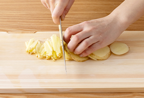 新じゃがいもはたわしなどで良く洗い、せん切りにします。(新じゃがいもを使用しない場合は皮をむき、芽を取ります。)