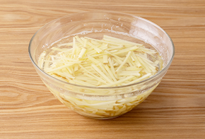 ボウルにせん切りにしたじゃがいもを入れて水にさらします。水の濁りが無くなるまで何度が水を変えます。