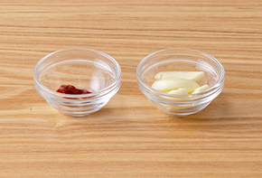 赤唐辛子は種を取って輪切りにし、にんにくはつぶします。(辛いのが好きな方は赤唐辛子を細く輪切りにします。にんにくも細かく切ると香りが、より強く出ます。)
