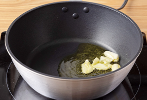 フライパンにオリーブオイルを熱し、にんにくを入れ弱火で香りを出すように加熱します。