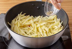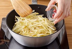 新じゃがいもに火が入ったら、塩、黒こしょうで味を調えます。