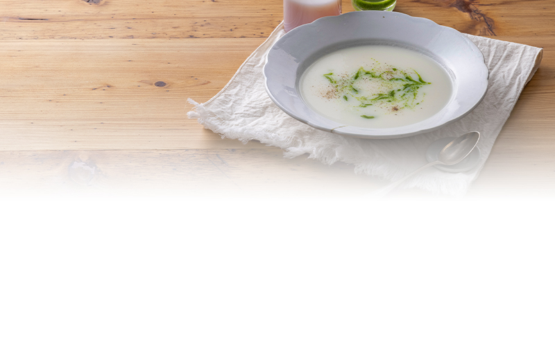②が柔らかくなったらだし汁を加え、10分ほど煮てミキサーにかけたら、塩(分量外)で味を整えます。