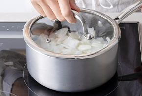 鍋に①と[A]を入れて全体を混ぜ、弱火で20分蒸し煮にします。(時々混ぜます)