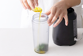 大葉は沸騰した湯でさっと茹でて水気をきり、[B]と合わせてミキサーにかけてソースを作ります。