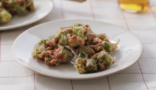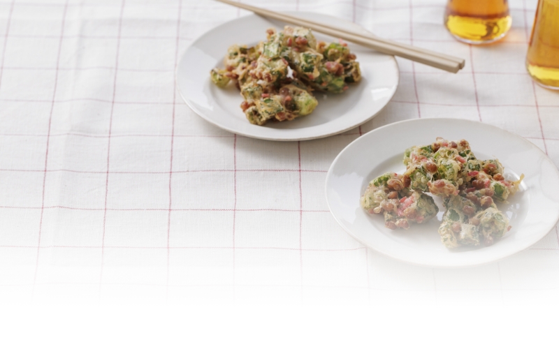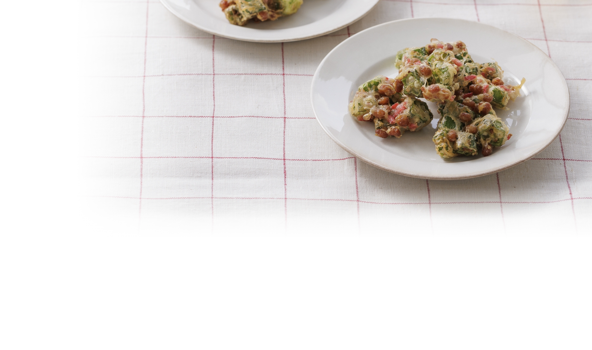 納豆とオクラをかき揚げに入れて仕上げます。納豆の独特な臭みも和らぎ美味しく頂けます。