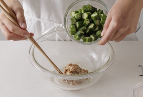 オクラは板ずりしてガクと先端を落とし1cm幅に切り、紅生姜は細かく刻みます。