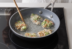 ④をスプーンですくい、中温の油でこんがりするまで揚げたらお好みで塩を振ります。