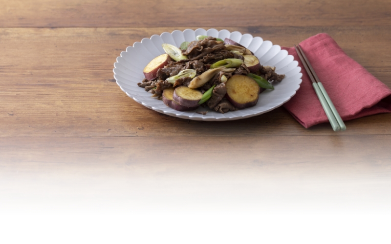 さつまいもと牛肉を使ってフライパンで仕上げる秋らしい簡単に出来るおかずです。