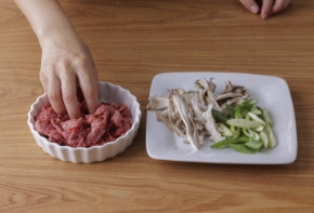 牛こま切れ肉は酒・しょうゆを振ってもみこみ、下味をつけます。舞茸はほぐし、長ねぎは斜めに切ります。