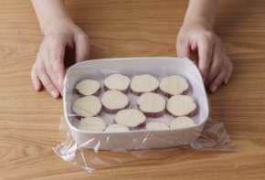 さつまいもは1cm厚さの輪切り(又は半月切り)にして水にさらします。その後耐熱容器に並べてラップをし、電子レンジで加熱します。(600w2分)