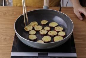 フライパンに油を入れて、水気を拭いたさつまいもを両面焼きます。焼き色が付いたら取り出します。