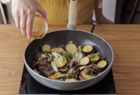 ③のフライパンに牛肉を入れて炒め、色が変わったら舞茸をいれて炒め合わせます。