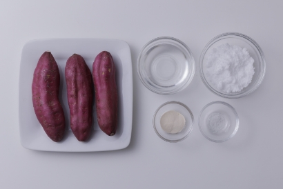 さつまいもは350g程使用し、2cm位の厚さに輪切りにして皮を厚めにむきます。切ったものは水にさらします。