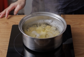 ①を鍋に入れ、浸かる位の水(分量外)を入れて火にかけます。沸騰したら10分程度、さつまいもが柔らかくなるまで茹でます。