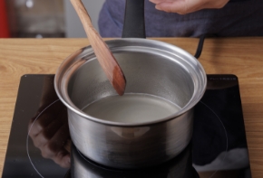 小鍋に水、粉寒天を入れてひと混ぜし、火にかけます。沸騰したら弱火にして1分程煮て火を止めます。