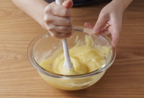 茹であがったらザルにあげて水気を切り、フードプロセッサ―に入れます。砂糖、塩を加え、滑らかになるまでかき混ぜたらボウルに入れます。