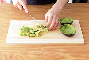 アボカドに包丁で縦真ん中にぐるりと1周切り込みを入れ、ねじるようにして半分に外します。包丁の刃元で種を刺して取り除き、皮を破らないように注意してスプーンで実を取り出します。