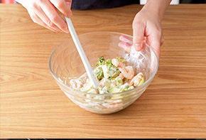 ②と茹でた海老をボウルに入れてマヨネーズで和え、塩で味を調えます。
