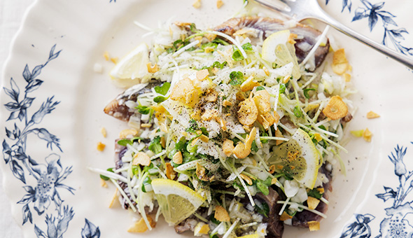 貝割れ大根も加えさっと和え、器に盛ります。お好みでレモンのスライスを飾り、ブラックペッパーをふります