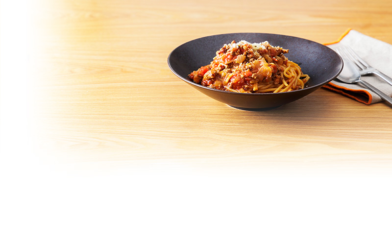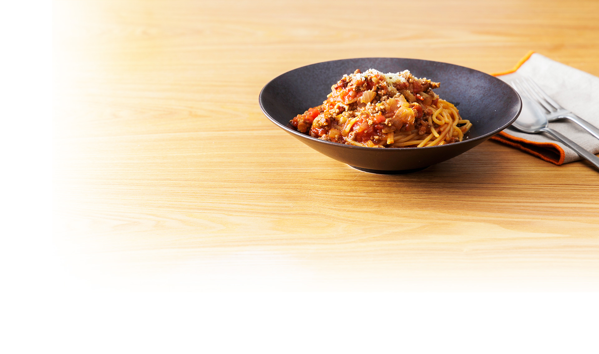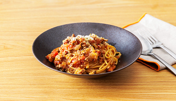 お肉たっぷりのミートソースにきのこも加えたボリュームのあるパスタです。フライパン一つで簡単にできるのもうれしいポイントです。