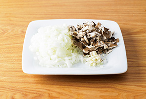 玉ねぎ、にんにくはみじん切りにします。舞茸は粗みじん切りにします。