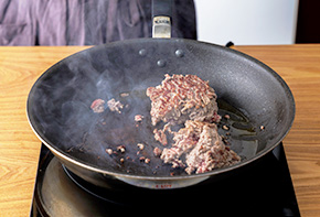 フライパンにオリーブオイルを入れ、合いびき肉を塊のまま入れ、焼き色がつくまで両面やきます。