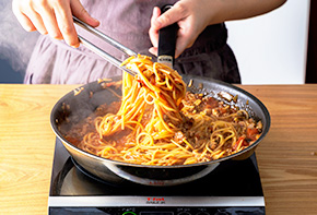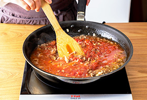 途中に蓋をあけてかき混ぜます。パスタが柔らかくなったら、塩(分量外)で味を整えます。(茹で時間が長いパスタで水分が足りなくなる場合は水を足します。)