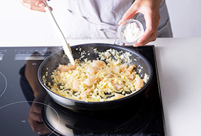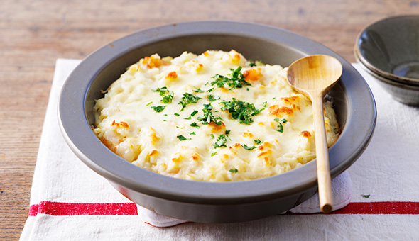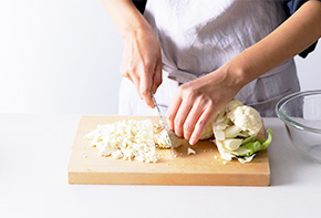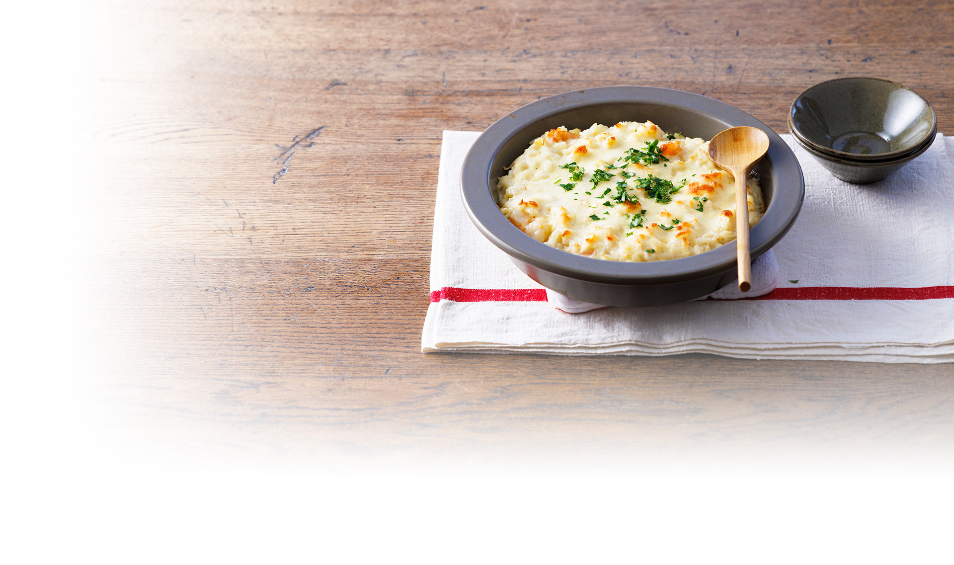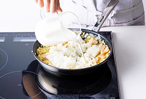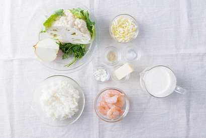カリフラワーがごはん代わりになり、食感がよいので飽きずに食べられます。生クリームを使っているので濃厚なコクのあるドリアです。