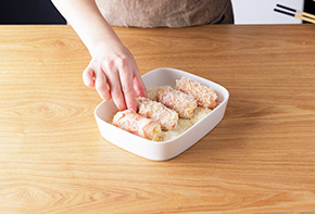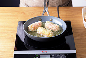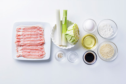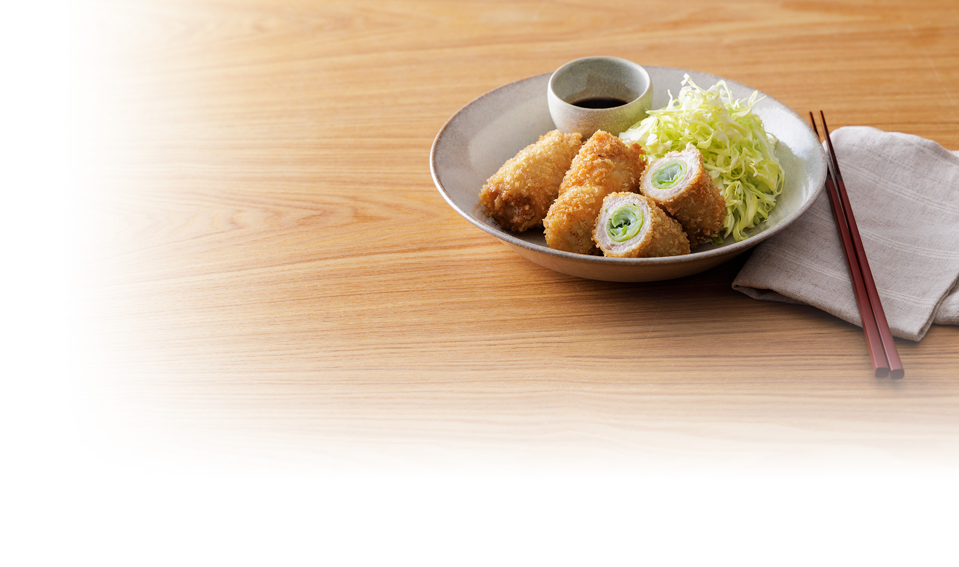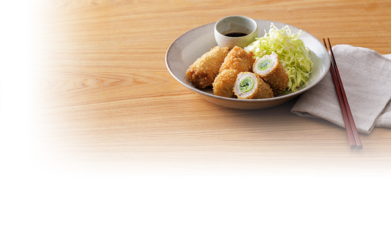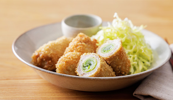 カラっと揚がったら、せん切りにしたキャベツと共に盛り付けて完成です。ソースをかけていただきます。お好みで味噌だれやおろしポン酢でもお試しください。