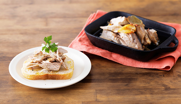 冷めたら軽くほぐし、オイルに漬けたまま冷蔵庫で保管します。そのままでもおいしくいただけます。パンに乗せたり、マヨネーズで和えたりなど、様々なアレンジが効きます。今回は冷蔵庫で保管しても固まりにくい米油を使用しましたが、オリーブオイルを加えたり、好みの油で作ってみてください。