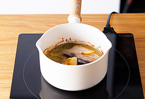 火にかけ、ふつふつと沸くくらいの柔らかい火加減で10分ほど煮ます。その後、上下を裏がえしてさらに5分ほど煮ます。