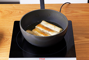 カリっと揚がったらよく油をきって器に盛ります。そのままでもおいしくいただけますが、お好みでしょうゆをつけて召し上がってください。お弁当などにもおすすめです。